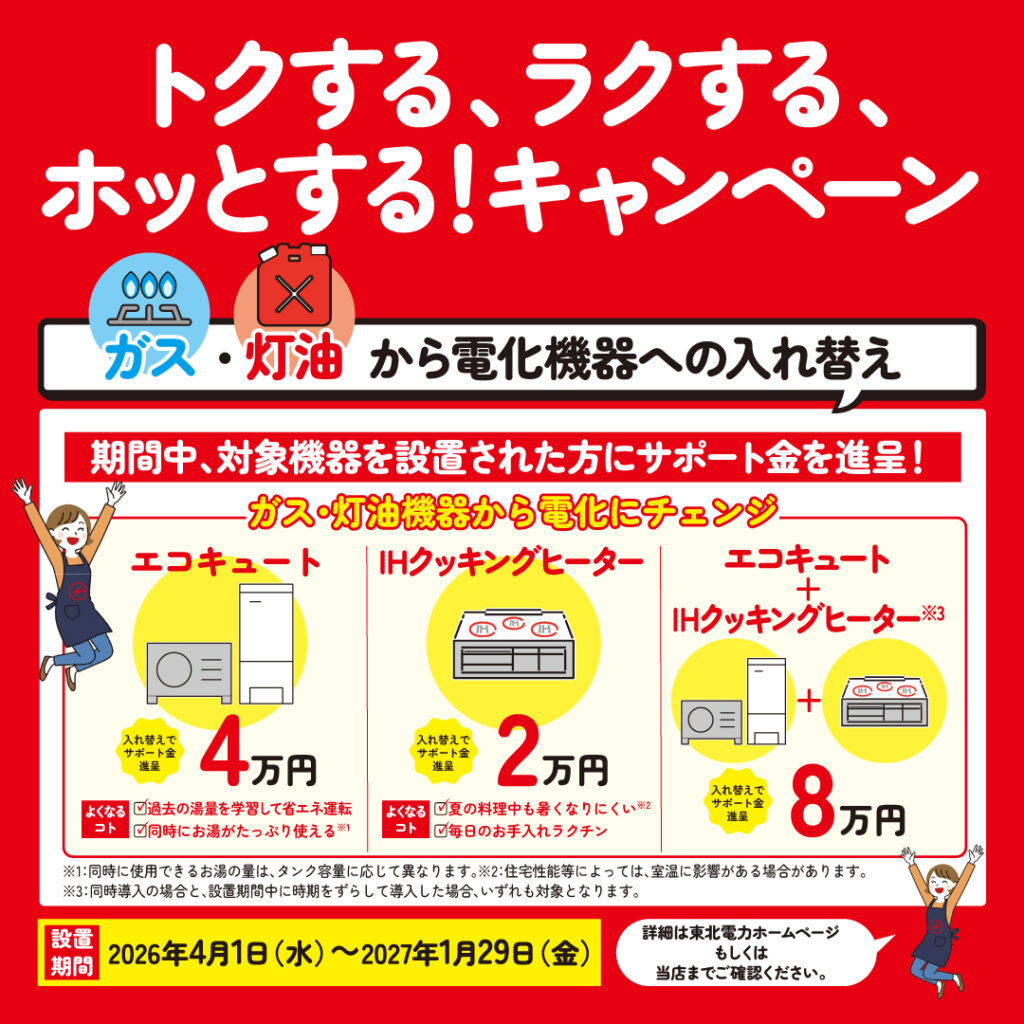 ①東北電力との電気のご契約1需要場所1電灯契約につき、同一機器1つまでが対象となります。キャンペーン対象機器をセットで購入された場合は、別々にお申込みが必要です。